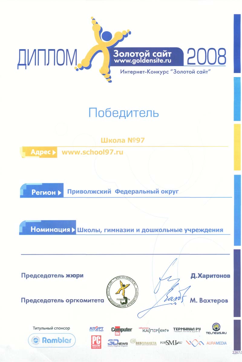 Школа № 97 стала победителем Девятого Интернет - Конкурса "Золотой сайт России" среди государственных учреждений Приволжского Федерального Округа