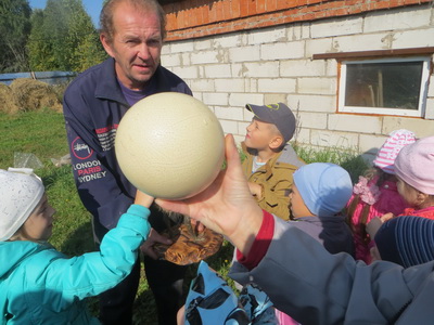 Две старшие группы детского сада "Гармония" вместе со своими воспитателями, посетили страусиную ферму. По пути к страусам, ребята встретили и других животных. Дошколята покормили маленьких кроликов морковкой и капустой. А в загоне они увидели и самих страусов, ростом со взрослого человека. Дети были в восторге от этих удивительных птиц. Также все желающие могли подержать в рука страусиное яйцо, которое по размерам чуть меньше футбольного мяча. Детям очень понравилась экскурсия и они выразили желание в будущем посетить страусиную ферму еще раз.